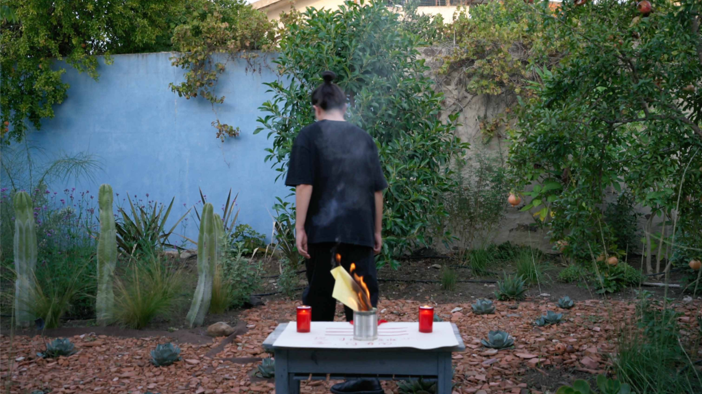 During the performance, the artist lights candles arranged on a carefully designed altar and progressively burns the rain-invocation talismans, symbolizing a ritualistic process of release and liberation. After each burning, the artist paces slowly around the altar, repeating this action three times. This measured, rhythmic walking represents not only a symbolic expression of internal anxiety but also the struggle stemming from cultural collisions. After all the talismans are burned, the artist ties a red string to a plant, symbolizing a connection to Chinese traditional culture while also embodying an attempt to transcend it.